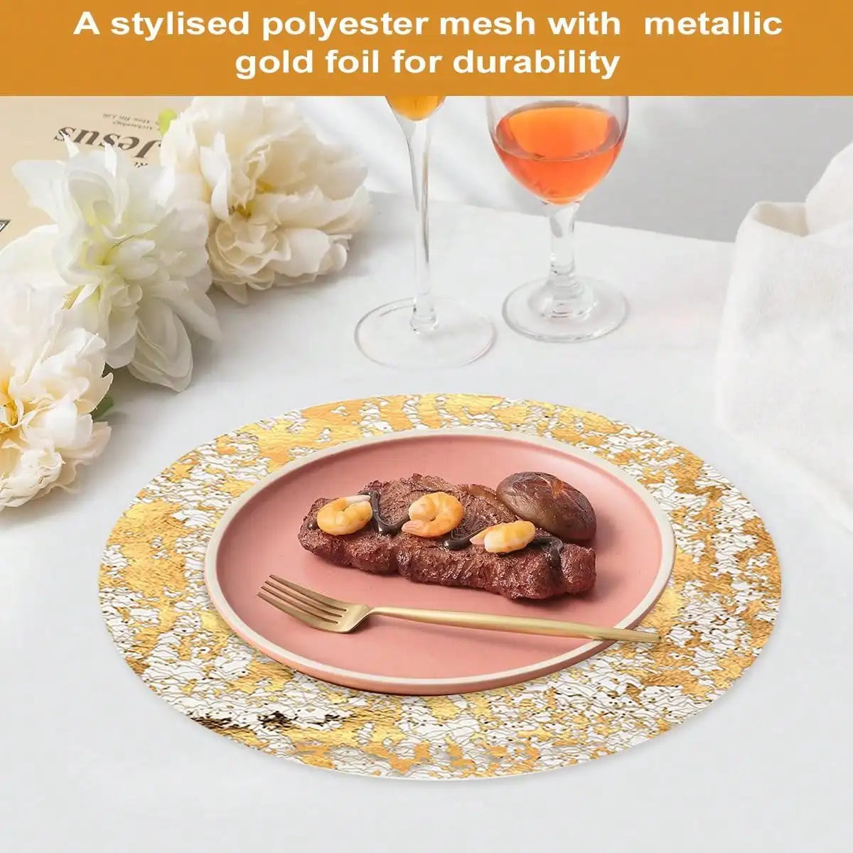 Magnificent Material and Eye Catching: our disposable placemats for dining table are made of quality material, representing their durability and long lasting elegance; They feature a captivating thin mesh design with metallic gold foil and laminated sequins, adds a dash of sparkly gold glamour to your event, taking the decoration up a notch.