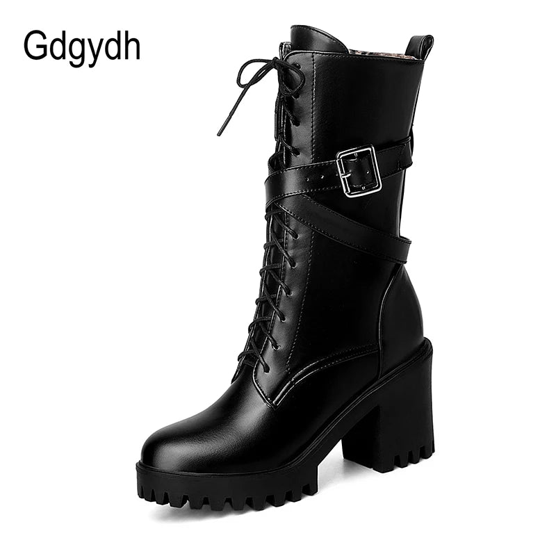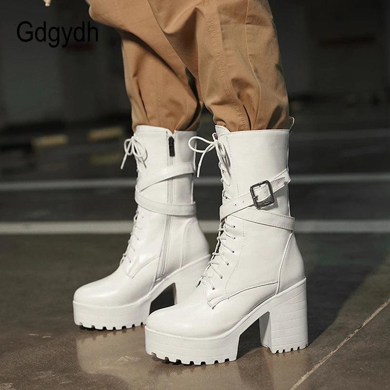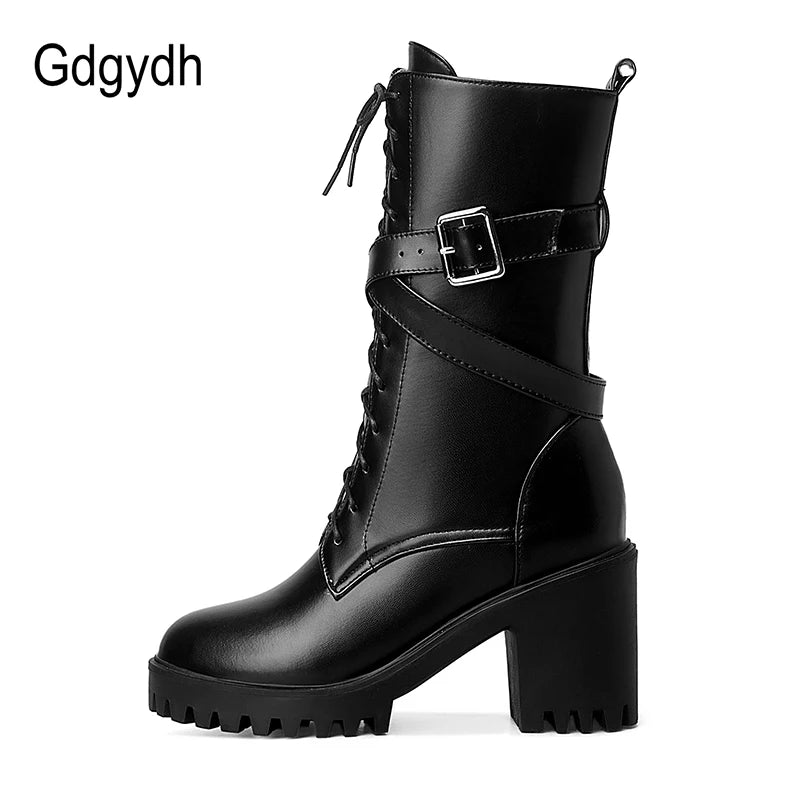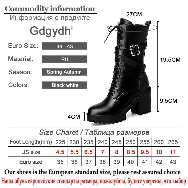 Gdgydh Women Mid-calf Boots Round Toe Thick High Heel Platform Shoes Soft Leather Punk Female Motorcycle Boots Plus Size 34-43