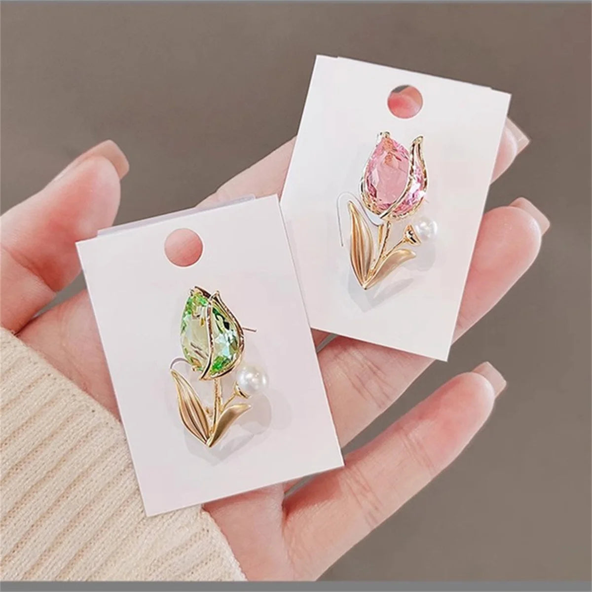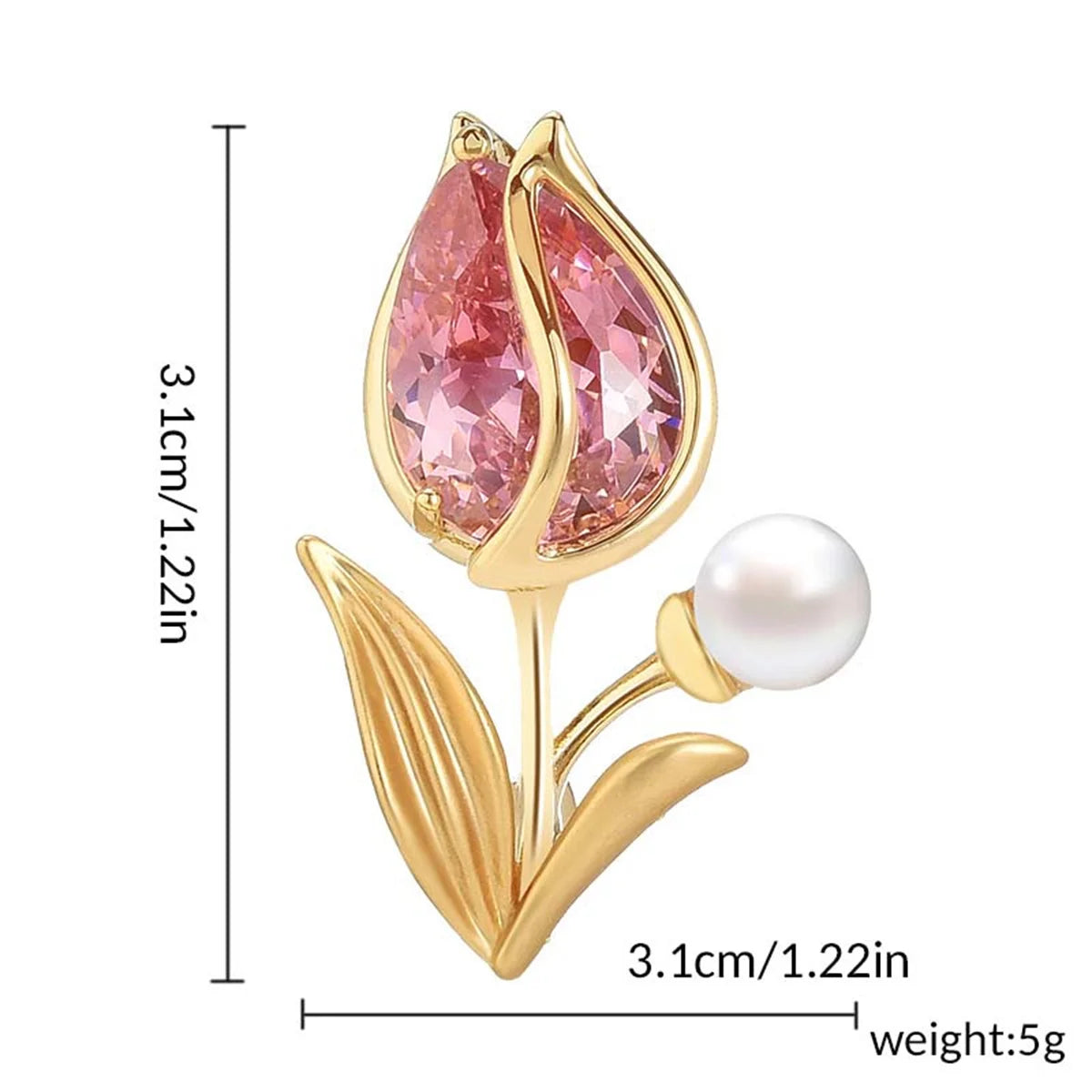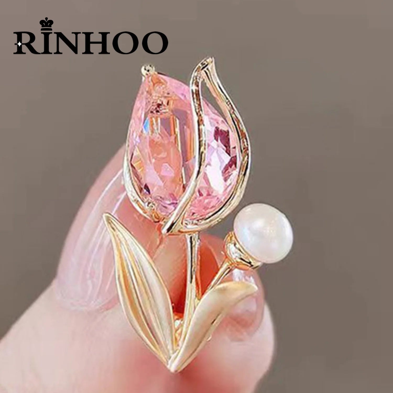 Rinhoo Luxury Pink Green Zircon Tulip Flower Brooch For Women Elegant Pearl Floral Lapel Pins Plant Button Badge Wedding Jewelry