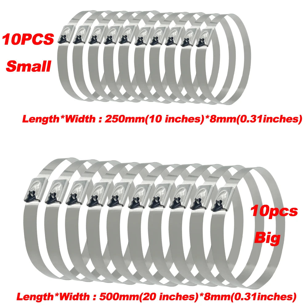 2.【Size】-------- Big Size: 500mm(20 inches)*8mm(0.31inches) Stainless Steel Band Clamps;Small size:250mm(10inches)*8mm(0.31inches) Stainless Steel Band Clamps;This kit can meet all your different Daily needs.