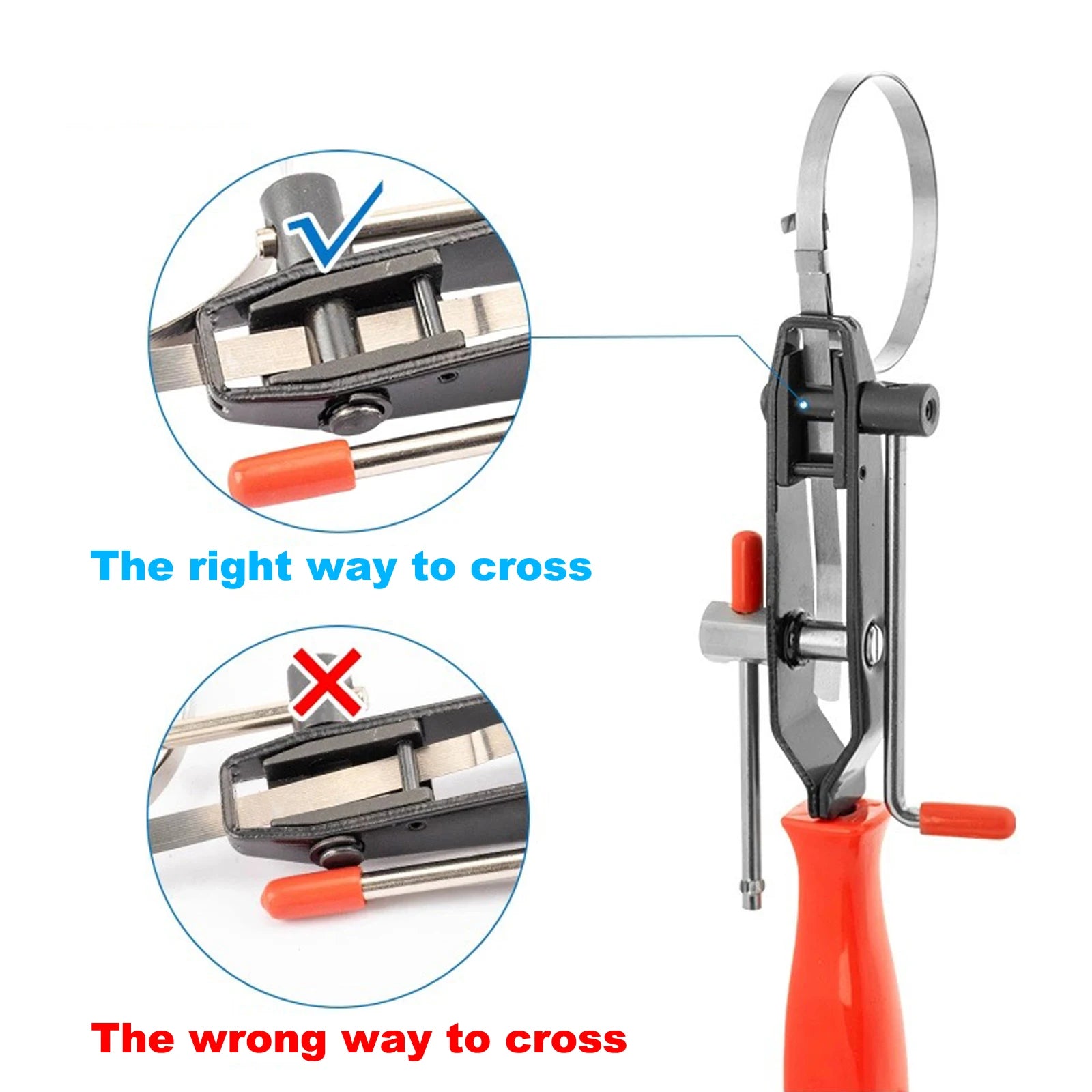 5.【Easy To Use】 ----- Wrap free-end clamps 3/8-inch or 1/4-inch roll band and clip around boot, thread band through clip to tool nose and through winding mandrel slot, place 1/2-inch ratchet wrench on winding mandrel and turn until tension is applied, rotate tool over boot bending band back onto clip to apply tension and use cutter pliers.