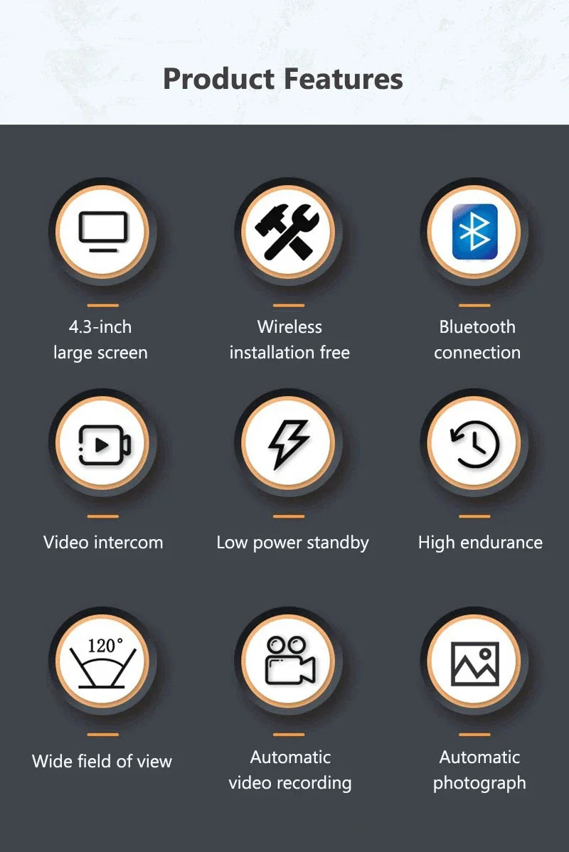 * 4.3-inch IPS screen, full-view display, clear visibility, no need to open the door to view the real-time situation outside the door, with screen display, more convenient and safer.